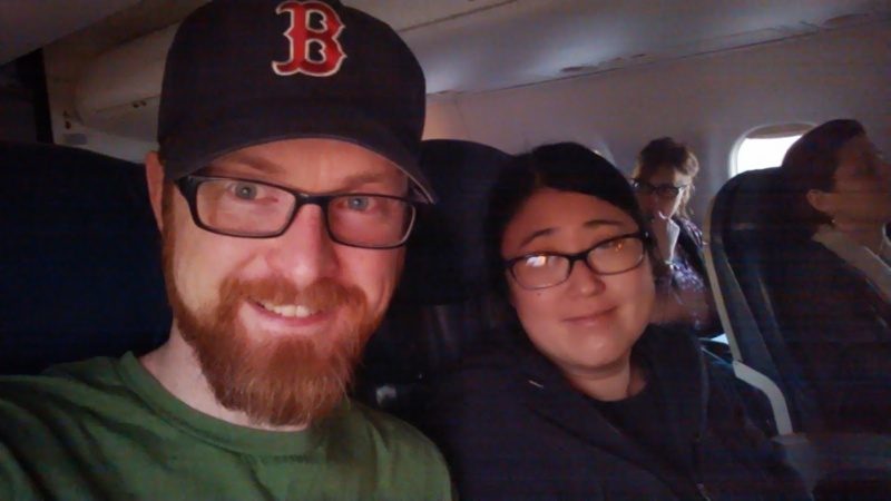 Where to start? The plane, I suppose. Here we are just starting off on our trip to Boston, Becky, me and the hat. I think the hat looks fine in this picture and of course Becky is always cute but unfortunately I look like a maniac. I guess I was just too excited for a weekend off. We have no plans until Monday morning when I need to go to work.